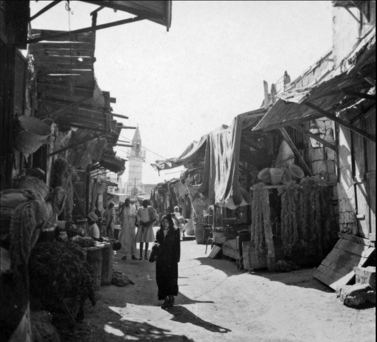 مثلا… أمامنا هذه الصورة من الخمسينيات تُظهر سوقاً وأناساً يتحركون. المشهد كله يشع نوعاً من الهدوء لا أعرف كيف أصل إليه… بمعنى عندما أنظر إليها، لا أريد أن أحلل من التقطها أو ما تعنيه لتراثنا أو كيف تتناسب مع سردية أكبر عن الهوية. أريد فقط أن أجلس مع الصورة، أن أشعر بما يجعلها تبدو بطيئة للغاية، غير متعجلة.